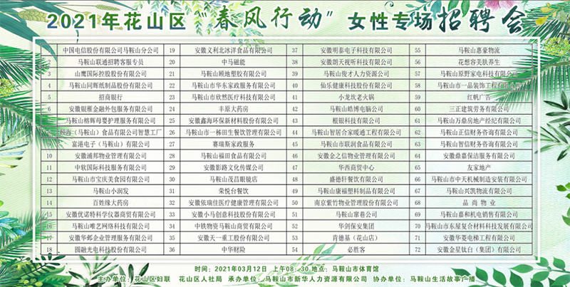 2021年3月,新華人力受花山區(qū)婦聯(lián)及花山區(qū)人社局委托,舉辦“春風(fēng)行動”女性專場招聘會。參會企業(yè)75家,提供就業(yè)崗位數(shù)2484個。